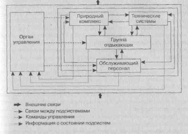 В отечественной рекреационной географии обоснована теория территориальных рекреационных систем как предмет научного исследования и одна из основных форм организации отдыха и туризма. Рекреационная система - сложная социально управляемая (частично самоуправляемая) система, центральная подсистема которой - субъекты туризма, а целевая функция - наиболее полное удовлетворение их рекреационных потребностей. Рекреационная система состоит из взаимосвязанных подсистем: отдыхающих, туристов, природных комплексов, материальной базы и рекреационной инфраструктуры, обслуживающего персонала и органа управления. Природный комплекс - взаимосвязанное и взаимообусловленное сочетание природных объектов и явлений - выступает не только как ресурс, но и условие удовлетворения рекреационных потребностей людей. Специфическими характеристиками природных комплексов считаются их емкость, устойчивость, комфортность, разнообразие, привлекательность. Группа отдыхающих характеризуется параметрами поведения, описываемыми с помощью циклов рекреационных занятий. Отношения с другими подсистемами дифференцируются в зависимости от социальной, возрастной, психологической, национальной, профессиональной, региональной и индивидуальной избирательности определенных групп людей, условий и ресурсов туризма. Технические системы обеспечивают обычную жизнедеятельность отдыхающих и обслуживающего персонала и удовлетворяют специфические туристские потребности туристов. Обслуживающий персонал с помощью технических систем производит, собирает, сохраняет и доставляет отдыхающим комплекс услуг, удаляет и утилизирует отходы. Орган управления сопоставляет информацию о мере удовлетворения потребностей туристов с информацией о состоянии других подсистем, материальных и финансовых резервов, принимает хозяйственные решения. Свой взгляд на особенности структуры рекреационной системы предлагают Л. Г. Лукьянова и В. И. Цыбух (рисунок 1).