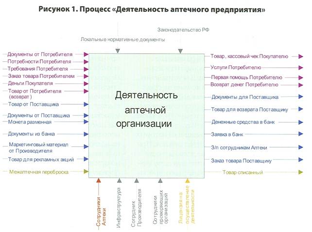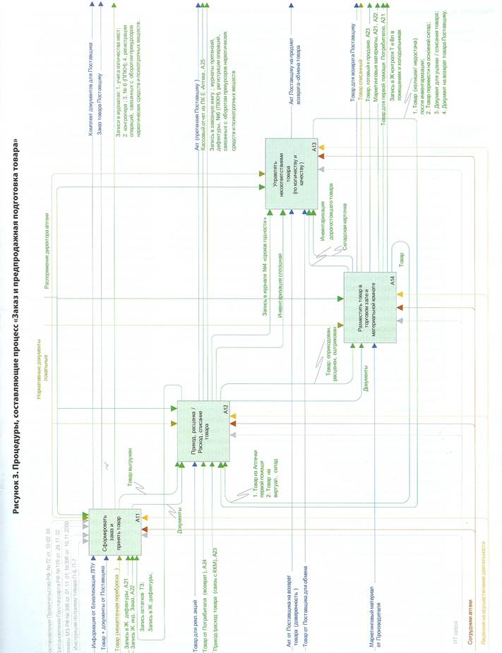 Определив процессы аптечного предприятия, попробуем рассмотреть, какие функции они предполагают, какая информация и от кого должна передаваться на входе и на выходе, каким образом эта информация передается, а также нормативные документы, которые необходимо учитывать при осуществлении деятельности. Определим, какие процедуры необходимо формализовать для осуществления процесса «Заказ и предпродажная подготовка товара».