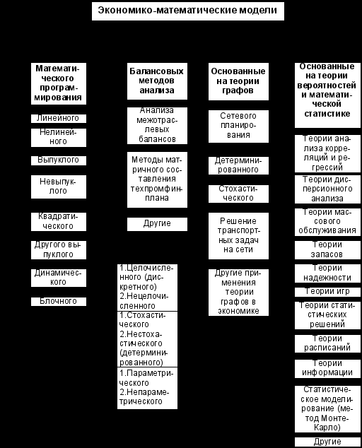 Рис. 2.1. Класифікація економіко-математичних моделей. . До математичного програмування відноситься також і динамічне програмування. Моделі динамічного програмування дозволяють знаходити оптимальне рішення в умовах, коли на кінцеві результати впливає результат здійснення рішення на попередньому етапі, а на нього - результати здійснення рішення на попередньому йому етапі і т.д. У процесі оптимізації управлінських рішень широко застосовуються також моделі, засновані на математичній теорії графів. Приватним видом таких моделей є моделі мережного планування, які використовуються як на стадії оптимізації прийнятих рішень, так і при організації їх виконання, контролі виконання, тобто є наскрізними моделями, використовуваними на всіх етапах, аж до здійснення прийнятого управлінського рішення. В залежності від можливості або неможливості точного визначення тривалості робіт при побудові мережного графіка моделі мережного планування діляться на детерміновані та стохастичні. До моделюванню, заснованому на теорії графів, відноситься також вирішення транспортних задач на мережі та інші додатки до цієї теорії в економічній роботі. Для оптимізації управлінських рішень застосовуються також і моделі балансових методів аналізу, що представляють собою прямокутні таблиці, в яких по одному з напрямків (по горизонталі або по вертикалі) проставлені галузі або підрозділу, що беруть участь у виробництві якоїсь сукупності продуктів, і вказані кількісні дані про величину участі їх у виробництві, а по іншому напрямку представлені ці ж галузі або підрозділу в якості споживача тієї ж сукупності продуктів і вказані їх потреби. Такі моделі дозволяють приймати рішення, що враховують взаємозв'язки між окремими підрозділами виробництва і необхідність балансу між виробництвом та споживанням. Рішення з використанням цих моделей спрямовані на пропорційний розвиток виробництва. Застосовуються вони як на рівні міжгалузевого планування, так і при плануванні в масштабі галузі або навіть окремого підприємства. Перераховані види моделей відносять звичайно до групи детермінованих моделей, хоча деякі з них можуть бути пов'язані з розрахунками на основі застосування елементів математичної статистики і теорії ймовірностей, наприклад, стохастичне програмування або стохастичне мережне планування. Іншу велику групу економіко-математичних моделей, застосовуваних при оптимізації управлінських рішень, складають стохастичні моделі або моделі, засновані на теорії ймовірностей і математичній статистиці. До стохастичним моделей відносяться моделі теорії аналізу кореляцій і регресій, теорії дисперсійного аналізу, теорії масового обслуговування, методів статистичних випробувань, теорії ігор, теорії статистичних рішень, теорії інформації, теорії надійності, теорії розкладів, теорії запасів та ін