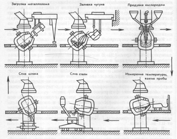 1) Загрузка металлолома, заливка чугуна; 2) Продувка кислородом (t=2500 оС ); 3) Измерение температуры, взятие пробы. 4) Слив стали; 5) Слив шлака;