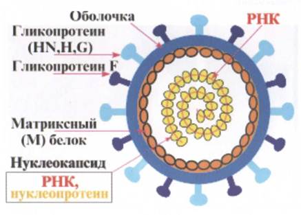 Схема вируса кори ВИРУС КОРИ Корь — острое инфекционное заболевание. Первым описал ее арабский врач Разес (IX век). Вирусная этиология кори была доказана в 1911 г. Т. Андерсеном и Дж. Гольдбергером. Вирус был обнаружен в 1938 г. X. Плотцем. В 1954 г. Дж. Эндерс и У. Фиблес выделили вирус кори от больного на первичной почечной культуре обезьян и человека. Морфология. Вирус кори имеет размеры 90—140 нм форма в основном сферическая, но встречаются нитевидные образования. Вирус имеет наружную оболочку, его нуклеокапсид состоит из спиральной симметрии, содержит РНК.