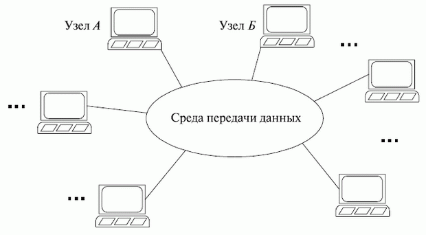 Первое из этих требований выполняется при наличии в САПР вычислительных машин и систем с достаточными производительностью и емкостью памяти. Второе требование относится к пользовательскому интерфейсу и выполняется за счет включения в САПР удобных средств ввода/вывода данных и, прежде всего, устройств обмена графической информацией. Третье требование обусловливает объединение аппаратных средств САПР в вычислительную сеть. В результате общая структура компьютерной сети представляет собой сеть узлов, связанных между собой средой передачи данных (рис. 8.1).