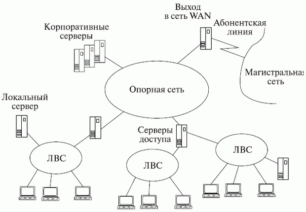В более крупных по масштабам проектных организациях в сеть включены десятки-сотни и более компьютеров, относящихся к разным проектным и управленческим подразделениям и размещенных в помещениях одного или нескольких зданий. Такую сеть называют корпоративной. В ее структуре можно выделить ряд ЛВС, называемых подсетями,и средства связи ЛВС между собой. В эти средства входят коммутационные серверы (блоки взаимодействия подсетей). Если коммутационные серверы объединены отделенными от ЛВС подразделений каналами передачи данных, то они образуют новую подсеть, называемую опорной (или транспортной), а вся сеть оказывается иерархической структуры. Если здания проектной организации удалены друг от друга на значительные расстояния (вплоть до их расположения в разных городах), то корпоративная сеть по своим масштабам становится территориальной сетью (WAN- Wide Area Network).В территориальной сети различают магистральные каналы передачи данных (магистральную сеть), имеющие значительную протяженность, и каналы передачи данных, связывающие ЛВС (или совокупность ЛВС отдельного здания или кампуса) с магистральной сетью и называемые абонентской линией или соединением "последней мили". Обычно создание выделенной магистральной сети, т. е. сети, обслуживающей единственную организацию, обходится для этой организации слишком дорого. Поэтому чаще прибегают к услугам провайдера,т. е. фирмы, предоставляющей телекоммуникационные услуги многим пользователям. В этом случае внутри корпоративной сети связь на значительных расстояниях осуществляется через магистральную сеть общего пользования. В качестве такой сети можно использовать, например, городскую или междугородную телефонную сеть или территориальные сети передачи данных. Наиболее распространенной формой доступа к этим сетям в настоящее время является обращение к глобальной вычислительной с ети Internet. Для многих корпоративных сетей возможность выхода в Internet является желательной не только для обеспечения взаимосвязи удаленных сотрудников собственной организации, но и для получения других информационных услуг. Развитие виртуальных предприятий, работающих на основе CALS-технологий, с необходимостью подразумевает информационные обмены через территориальные сети, как правило, через Internet. Нужно, однако, отметить, что использование сетей общего пользования существенно усложняет задачу обеспечения информационной безопасности. Структура ТО САПР для крупной организации представлена на рис. 8.3. Здесь показана типичная структура крупных корпоративных сетей САПР, называемая архитектурой клиент-сервер.В сетях "клиент-сервер" выделяется один или несколько узлов, называемых серверами,которые выполняют в сети управляющие или общие для многих пользователей проектные функции, а остальные узлы (рабочие места) являются терминальными - их называют клиентами,в них работают пользователи. В общем случае сервером называют совокупность программных средств, ориентированных на выполнение определенных функций.Но если эти средства сосредоточены на конкретном узле вычислительной сети, то тогда понятие "сервер" относится именно к узлу сети.