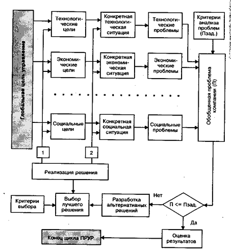 Деятельность любой организации представляет непрерывный цикл разработки, выбора и реализации различных УР. В этом цикле в основных процедурах разработки и реализации УР имеется много общего: логика процесса РУР, приемы, методы и технологии. Логика процесса РУР может быть представлена в виде схемы. В ее основе — блок «Глобальная цель управления». Глобальная цель управления любой социальной системой (страной, компанией, семьей или неформальной организацией) заключается в максимальном удовлетворении потребностей и интересов человека, коллектива, общества. В рамках глобальной цели управления формируются технические, технологические, экономические, социальные и другие цели.