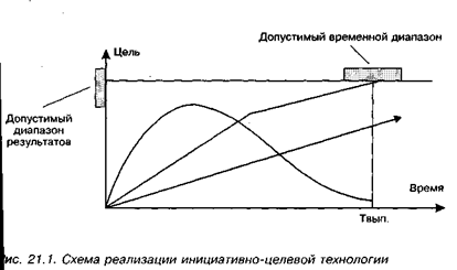 Успешная реализация стратегических задач предполагает их тесную увязку с тактическими решениями, которые определяют конкретные способы осуществления стратегий, необходимую линию поведения для их достижения. Рекомендуется уже при разработке стратегий рассматривать возможные варианты тактики. Это диктуется также и тем обстоятельством, что стратегические решения рассчитаны на длительный срок, в течение которого эффективность выполнения тактических решений зависит от изменений как в фирме, так и за ее пределами. Чем длительнее срок стратегического решения, тем менее точен прогноз развития событий. Поэтому при выборе варианта стратегического решения рекомендуется ориентироваться на временную субоптимизацию. Это тем более необходимо в условиях влияния всевозможных факторов и появления альтернатив действий. Технологии принятия и разработки управленческого решения - это искусство, мастерство и умение руководителя осуществлять управленческое воздействие на персонал для достижения общих и ключевых целей организации. В отличие от технократических технологий, технологии РУР не являются детерминированными, поскольку ее объектами являются человек, бригада, бюро, компания и т.д. Поэтому и требуется постоянная работа по совершенствованию условий применения тех или иных технологий РУР. В состав технологий РУР входят целевые и процессорные технологии. К целевым относят инициативно-целевые, программно-целевые и регламентные технологии. Целевая технология (ЦТ) в целом - это технология, основанная на приоритете целей над ситуациями. Инициативно-целевая технология основана на выдаче заданий для разработки или реализации УР, без указания средств и методов их выполнения. Она рассчитана на инициативного и профессионального исполнителя. Технология предусматривает разработку руководителем только конечной цели управления и сопутствующих ей задач, а также срока выполнения (Твып.) без указания механизма ее достижения. Это обусловлено тем, что руководителю самому не известны конкретные пути достижения цели и он предоставляет исполнителям право на инициативу. Обычно такая ситуация складывается при инновационной деятельности, а также при недостаточном профессиональном уровне руководителя или другого инициатора УР. При этом возможны различные варианты выполнения работ (рис. 21.1): • цель может быть не реализована по каким-либо причинам (кривая 1). Например, в процессе ее выполнения уволился специалист, существенно уменьшились необходимые ресурсы и др.; • цель может быть достигнута в предусмотренные сроки в пределах допустимого временного диапазона (кривая 2); • цель может быть достигнута за пределами установленного срока (кривая 3). Возможно, что такой исход будет допустимым, а возможно, что к моменту достижения цели она станет неактуальной или просто ненужной. Инициативно-целевая технология дает большой простор для инициативных решений подчиненных. Основные условия эффективного использования данной технологии: решение разрабатывается для персонала численностью не более 10 человек, чтобы возможные неудачи не принесли больших убытков компании; время выполнения задания не должно превышать одного месяца со дня его выдачи также во избежание убытков; наличие высокого уровня профессионализма персонала или большого доверия к
