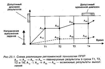 Программно-целевая технология РУР базируется на современных знаниях об эвристических методах и приемах РУР, экономико-математических методах и информационных технологиях. Для данной технологии эффективна кольцевая схема организационных отношений. Профессионализм выполнения задания определяется квалификацией руководителя, выдающего задание, а квалификация исполнителя играет вторичную роль. Технология формирует УР для управления по упреждению. Внимание! Программно-целевая технология ПРУР обычно гарантирует достижение поставленной цели компании. Регламентная технология состоит в выдаче руководителем заданий (целей, задач) с указанием средств и их возможных ограничений, ориентировочных методов и времени их выполнения. Эта технология основана на соблюдении требования (регламента) о безусловном не удалении от цели, то есть возможны: либо приближение к цели, либо неизменяемость результатов в течение краткого срока (рис. 23.1). Она обусловлена твердой уверенностью руководителя в положительных результатах УР, хотя он точно не знает конкретных путей достижения цели. Обычно такая ситуация складывается при разработке или реализации УР, касающихся больших масс людей, страны или миропорядка в целом. Технология предусматривает жесткий контроль над динамикой процесса выполнения' задания. Регламентная технология может привести к двум основным результатам: • достижение ощутимых положительных результатов от самого процесса выполнения цели (даже не от результатов) — А11 —> А21 —> А31 —> А41|; • отсутствие существенных положительных результатов в течение приемлемого времени (топтание на месте) — А12—>А22—> А32->А42. Основные условия эффективного использования данной технологии: • решение разрабатывается для персонала или населения численностью не менее 10 тысяч человек; • время выполнения задания не должно быть точно задано (важен сам процесс достижения цели); • наличие практической возможности существенного и непрогнозируемого ограничение ресурсов (финансовых, технологических, интеллектуальных, сырьевых и др.); • инновационный или длительный характер ПРУР. Рассматриваемая технология базируется на статистических методах, теории размытых множеств, теории разработки решений в условиях неопределенностей. Рекомендуемые структуры управления —