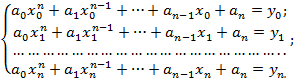 Эта система имеет единственное решение, так как по нашему предположению все х i различны. Решая эту систему относительно неизвестных а0, а1,..., ап, получим аналитическое выражение многочлена. Описанный прием можно использовать при решении задач интерполирования, но на практике используют другие более удобные и менее трудоемкие методы.