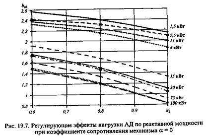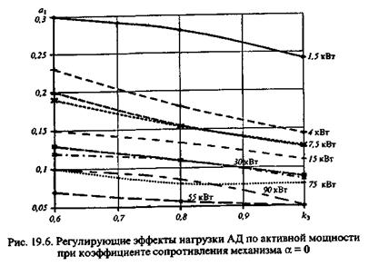 Наибольшее влияние на характер статических характеристик асинхронного двигателя оказывают номинальная мощность двигателя, его коэффициент загрузки и коэффициент, учитывающий изменение момента сопротивления производственного механизма при изменении скорости вращения ротора двигателя. На рис. 19.6 и 19.7 показаны зависимости регулирующих эффектов нагрузки АД по активной а 1 и по реактивной b 1л мощности от его коэффициента нагрузки k з при коэффициенте сопротивления механизма α = 0. Изменение напряжения на зажимах двигателя на 1 % от номинального приводит к изменению в ту же сторону потребляемой активной мощности на 0,05...0,35%, а реактивной мощности - на 0,8...3,2% при изменении k з от 1 до 0.