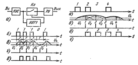 Рассмотрим принцип работы регенератора (рис. 6.18, а). На временных диаграммах (рис. 6.18,б и в) показаны идеальный и искаженный двоичные сигналы, причем последний действует на входе регенератора. Корректирующий усилитель (КУС) производит усиление и частичное восстановление формы импульсного сигнала. Устройство выделения тактовой частоты (УВТЧ) вырабатывает последовательность стробирующих импульсов, следующих с частотой fT=1/T (рис. 6.18, г). В моменты действия этих импульсов замыкается ключ (Кл) и отсчеты сигнала U1, U2, U3, … проходят в решающее устройство (РУ). Здесь происходит сравнение напряжений Ui с пороговым напряжением Uп. Если Ui>Uп, то на выходе РУ появляется стандартный импульс, в противном случае на выходе РУ формируется пауза (рис. 6.18, д). Таким образом, регенератор восстанавливает форму исходного цифрового импульсного, сигнала (отличие заключается в небольшом временном запаздывании, что несущественно). В работе регенератора возможны ошибки. Рассмотрим влияние искажений первого рода на процесс возникновения ошибок. На рис. 6.19, а-в изображен неискаженный двоичный сигнал, сигнал, действующий на выходе КУС, и тактовая последовательность импульсов, выработанная УВТЧ. В момент действия третьего импульса тактовой последовательности отсчет суммарного напряжения на входе РУ U3>Uп и вместо паузы в двоичном сигнале на выходе РУ появляется импульс, т. е. в процессе регенерации возникла ошибка (рис. 6.19, г).