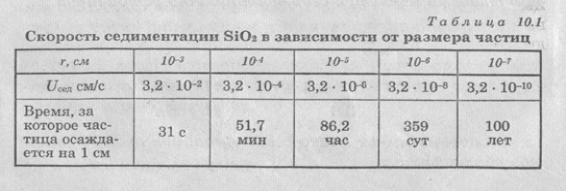 где νo — концентрация частиц на дне сосуда; νh, — концентрация частиц на высоте h от дна. ---гипсометрический закон Лапласа-Перрена. В этом случае система является седиментационно-устойчивой, но распределение частиц в ней не равномерное, а равновесное. Это распределение наблюдается, когда 10-5 < r < 10-3 см. В качестве примера рассмотрим дисперсную систему, в которой дисперсной фазой являются сферические частицы диоксида кремния SiO2, а дисперсионной средой — вода, ρ0 = 1,0 г/см3; η= 0,015 П. В таблице 10.1 приведены данные о седиментации в зависимости от радиуса частиц дисперсной фазы. Из таблицы следует, что седиментация в лиофобных золях протекает очень медленно. Итак, седиментационная устойчивость дисперсных систем определяется, главным образом, размерами частиц дисперсной фазы: • лиофобные золи (10-7-10-5см) — седиментационно устойчивые системы, характерна диффузия, обеспечивающая равномерное распределение частиц по объему системы; • микрогетерогенные системы (10-5-10-3 см) — устанавливается седиментационно-диффузионное равновесие, для которого характерно гипсометрическое распределение частиц по объему системы; • грубодисперсные (более 10-3 см) — седиментационно неустойчивые системы, происходит быстрая седиментация.
