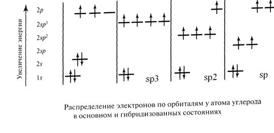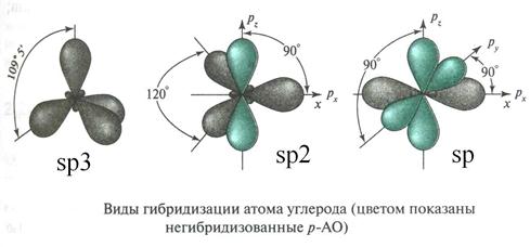 При образовании связей происходит т.н. гибридизация атомных орбиталей: несколько близких по энергии орбиталей как бы усредняются, образуя такое же количество орбиталей равных по энергии и отличающихся геометрической направленностью. Гибридные орбитали обеспечивают более полное перекрывание при образовании связей, и это делает гибридизацию энергетически выгодной. У атома углерода различаются три типа гибридизации: · sp3 гибридизация, в ней участвует s-орбиталь и три р-орбитали; · sp2 гибридизация: s-орбиталь и две р-орбитали; · sp гибридизация: s-орбиталь и одна р-орбиталь.