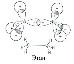Простая (ординарная) σ-связь образуется путем осевого перекрывания гибридных орбиталей. Молекула этана имеет трехмерную (тригональную) геометрическую структуру: