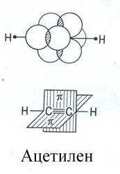 Тройная связь образуется между двумя sp-гибридизованными атомами и состоит из σ-связи и двух π-связей, причем плоскости π-связей перпендикулярны друг другу. Молекула ацетилена имеет линейную геометрическую структуру (все σ-связи находятся на одной прямой):