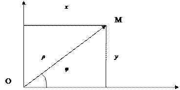 Не всегда простейшая декартова система координат является наиболее удобной для представления геометрических образов. Часто используется полярная система координат, в которой точка на плоскости задается поворотом направленного отрезка положительной полуоси ОХ на некоторый угол φ. Положительным направлением поворота считается направление против часовой стрелки. Задаваясь длиной отрезка ρ и углом поворота φ, можно с таким же успехом, как и с помощью задания декартовых координат Х и Y, задать любую точку на плоскости. При этом направленный отрезок, начало которого всегда совпадает с началом координат О, называют радиус-вектором. Заметим, что длина радиус-вектора в полярных координатах всегда является положительным числом (вырожденный случай — само начало координат, тогда ρ = 0), а полярный угол φ меняется в пределах от 0 до 2π. Декартовы координаты легко выразить через полярные: обозначив ОХ = х, ОY = y, найдем: