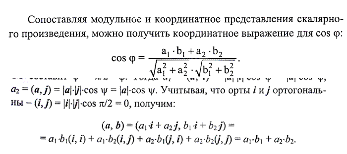 Введенное таким образом скалярное произведение фактически определяет соответствие между множеством векторов в линейном пространстве и множеством действительных чисел, так, что каждой паре векторов ставится в соответствие одно действительное число. Используемые здесь длины векторов чаще всего именуют модулями (уместна аналогия с модулем, вводимым в теории чисел, но ею надо пользоваться с осторожностью), поэтому данное определение скалярного произведения иногда не совсем удачно называют модульным определением. С ним тесно связано координатное представление скалярного произведения, часто используемое при расчетах.