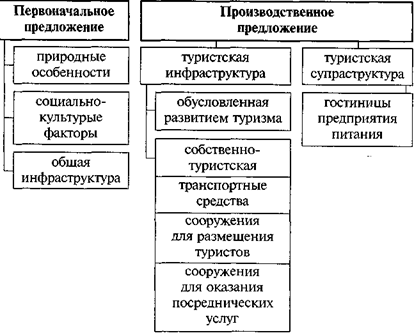 Туристское предложение состоит из первичного (первоначального) и производного предложений. Первичное предложение привлекает туристов своей естественной пользой и создается не только для туристских целей. Производное предложение состоит из элементов, которые создаются исключительно для туристского использования. Отнесение предложения к первоначальному или производному базируется на том, какие особенности, пригодные для использования в туризме, уже имеются, и какие должны быть созданы для привлечения туристов. Основу первоначального предложения составляют: – природные особенности страны (географическое положение, климат, топография, растительный и животный мир); – социально-культурные факторы (культура, традиции, постройки религиозного и мирового значения, менталитет, гостеприимность, обычаи); – общая инфраструктура (пути сообщения, коммуникации, газо-, водо- и электроснабжение, очистные сооружения, учреждения культуры и досуга). Производное предложение существует специально в туризме и состоит из туристской инфраструктуры и туристской супраструктуры. Туристская инфраструктура подразделяется на инфраструктуру, обусловленную развитием туризма, и собственно туристскую инфраструктуру. Инфраструктура, обусловленная развитием туризма, имеет много общего с общей инфраструктурой (первичным предложением) включает транспортные средства; сооружения для размещения туристов: туристские сооружения, курортные сооружения, развлекательные учреждения, центры для проведения конгрессов и семинаров; сооружения для оказания посреднических услуг (службы обслуживания и информации). В туристскую супраструктуру входят гостиничные предприятия и предприятия питания. Они не относятся к туристской инфраструктуре, поскольку проживание и питание имеют для туризма решающее значение. Если рассматривать отдельные элементы туристского предложения, то можно убедиться, что потребность в туристских услугах (туристский спрос) удовлетворяется, как правило, комплексом услуг, относящихся как к первичному, так и производному предложению. Таким образом, для удовлетворения туристского спроса необходимо наличие нескольких элементов. Если отсутствует какой-нибудь важный элемент, стратегическая цель туризма не может быть достигнута. Например, если нет снега, то невозможен отдых на лыжной базе, даже если присутствуют все остальные элементы.