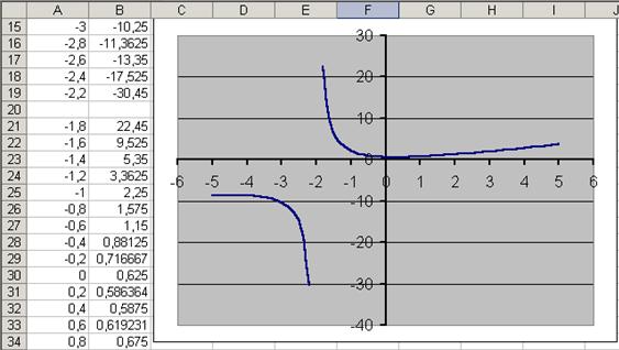 Рис. 2 ПРИМЕР 3. Построить график функции ОДЗ: Определение значения аргумента следует провести в два этапа. Например, от -5 до -1, а затем от 1 до 5,с шагом 0,1. ПРИМЕР 4. Построить график функции При построении этого графика следует использовать функцию ЕСЛИ. Например, в ячейке А7 (см. рис. 3) находится начальное значение аргумента, тогда в ячейку В7 необходимо ввести формулу: