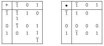 Видно, что знак числа совпадает со знаком первой цифры числа. Это означает, что не требуется указывать отдельно знак числа. Кроме того, важным достоинством является простота получения числа, противоположного данному по значению (см. первое и третье числа, равные – 17 и 17 в 10-ичном представлении). Для этого достаточно все цифры «1» заменить на « Арифметические действия над числами в троичной уравновешенной системе счисления можно задать с помощью таблиц.