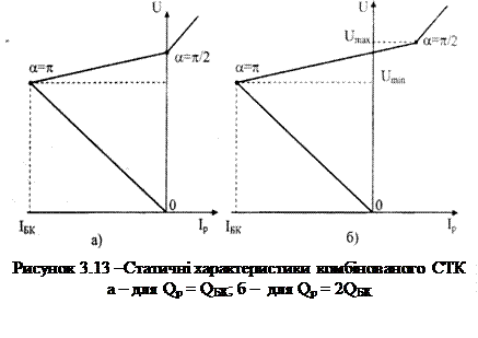 У другому випадку потужність реактора може змінюватися в діапазоні 0 < Qр < 2, а потужність нерегульованої БК залишається рівною QКБ = -1. Такий СТК може працювати в режимі генерування і споживання реактивної потужності так, що -1 ≤ Qстк ≤ 1 (рис. 3.13, б).