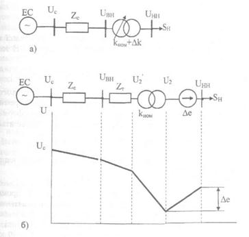 Рисунок 2.7 - Зміна напруги в електропередачі за допомогою трансформатора з РПН а - схема вузла з трансформатором; б - заступна схема з епюрою зміни напруги В заступній схемі (рис. 2.7,6) трансформатор поданий опором обмоток Так, у трансформатора ТДН-10000/110 номінальний коефіцієнт трансформації рівний kном = 115/11 = 10,455, ступінь регулювання