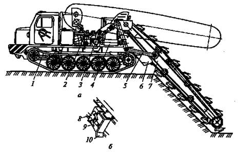У цепных экскаваторов (рис.140, а) отвальный конвейер 4 расположен на тягаче 1, а рабочее оборудование 7 соединено с тягачом по навесной схеме с помощью тяг 3 и 5 и может быть установлено в транспортное или рабочее положение на требуемую глубину траншеи гидроцилиндром 2 Рабочее оборудование состоит из рамы, двух ведущих звездочек или приводного граненого барабана, устанавливаемых в верхней части рамы, двух натяжных колес в ее нижней части и огибающей их и опирающейся на ролики замкнутой длиннозвенной цепи, на которой с определенным постоянным шагом закреплены ковши или заменяющие их рабочие органы. В последнее время в качестве рабочих органов используют комбинированные рабочие элементы (рис.140, б), состоящие из скребков 10 и установленных на арках 8 зубьев 9. Скребок выносит из траншеи отделенный от массива впереди идущими зубьями грунт, а зубья разрабатывают очередную стружку для ее выноса следующим за ними скребком. В пределах траншеи выносимый из нее грунт блокирован от просыпания лобовой и боковыми стенками, а по выходе из траншеи он перемещается в лотке 6 (рис.140, а), из которого отсыпается на отвальный конвейер. Комбинированные рабочие органы более эффективны по сравнению с применявшимися прежде ковшами, склонными к залипанию.