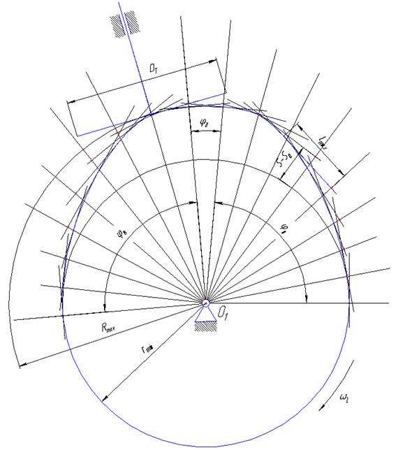После нахождения соответствующих точек, проводим через них перпендикуляры относительно лучей, которые имитируют тарелку в обращенном движении. В полученной замкнутой области проводим кривую, касающуюся всех тарелок – это необходимо для передачи непрерывного движения от кулачка к башмаку толкателя по одной линии. Полученный, таким образом, профиль кулачка, является конструктивным профилем. Радиус тарелки определяем по выражению Rт = Где: lmax – максимальное расстояние от оси толкателя до точки касания профиля кулачка тарелкой; е – дезаксиал толкателя в плоскости, перпендикулярной плоскости кулачковой шайбы. Для того чтобы спрофилировать кулачок с любым башмаком толкателя, кроме фазовых углов, которые диктуются технологическим процессом, выполняемым кулачком, необходимо выбрать закон движения толкателя и минимальный радиус кулачка.