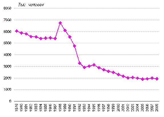 Рисунок 12.2. Число мигрантов, перемещающихся в пределах России, 1979-2008 годы, тысяч человек, зарегистрированных при прибытии