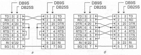 Рис 13.4 Нуль-модемный кабель а) – минимальный, б) – полный.