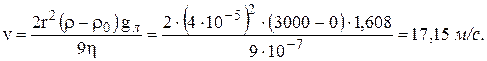 Пример 13.3. Найти скорость оседания космических частиц радиусом 4 10-5 м на поверхности Луны. Ускорение свободного падения на Луне g л = 1.608 м/c2; вязкость среды 10-7 (Па с), плотность вещества частиц 3000 кг/м3. Решение. Скорость оседания частиц находим по уравнению