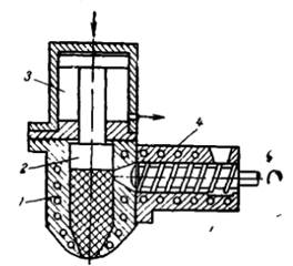 В таких агрегатах обеспечивается пластикация и перемешивание резиновой смеси перед впрыском, а следовательно, и равномерный прогрев смеси. Температуру смеси можно регулировать обогревом или охлаждением корпуса. Существенным недостатком литьевых агрегатов шнекового типа является невысокое давление литья (20-30 МПа), создаваемое ими.