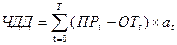 где ПРt, — приток реальных денег на шаге расчета t, руб.; ОТt, — отток реальных денег на шаге расчета t, руб.; at, — коэффициент дисконтирования для периода t, T— горизонт расчета, лет. Если капиталовложения являются разовой операцией и не требуют длительного времени, (то есть представляют собой денежный отток в нулевой период), формула расчета ЧДД записывается следующим образом: