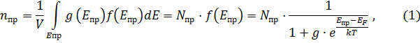 Статистика электронов в примесных полупроводниках. В примесных п/п электроны могут переходить в зону проводимости не только из валентной зоны, но и с донорных уровней, дырки же могут возникать при переходе электронов из валентной зоны на акцепторные уровни. Получим выражение для концентрации электронов на примесном уровне Eпр (примесь одного сорта):