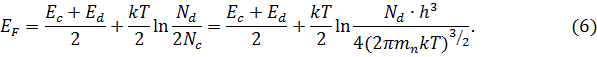 При T→0, EF→(Ec + Ed)/2, т.е. уровень Ферми стремится середине между дном зоны проводимости и Ed. Заметим, что при T→0, Nd+ →0, как это видно из (4), т.е. доноры не ионизированы.