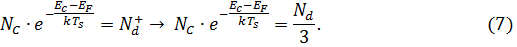 При повышении температуры от 0К, согласно (6) уровень Ферми сначала поднимается, т.к. знаменатель дроби под логарифмом при низких температурах меньше числителя, а второй член в (6) больше нуля и увеличивается с увеличением T. Однако при дальнейшем повышении температуры, уровень Ферми, достигнув максимума, начинает понижаться и, при некоторой T = Ts, пересекает уровень Ed. Но при T ≈ Ts пользоваться уравнением (6) уже нельзя, т.к. оно было получено при условии EF – Ed >> kT, или Nd+ << Nd, которое теперь не выполняется. Действительно, из (4) следует, что при совпадении уровня Ферми с уровнем Ed имеем Nd+ = Nd/3. В этом случае величину EF следует определять из более общего уравнения (5). Найдем температуру Ts из условий 1) Nd+ = Nd/3 и 2) EF = Ed: