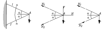 Два стержня, соединенные в т. А, находятся под действием силы Р (рис.2.5, а). Определить усилия, действующие в стержнях.