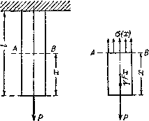 Рис.2.17. А) б) Подбор сечений с учетом собственного веса (при растяжении и сжатии) При установлении внешних сил, растягивающих или сжимающих элементы конструкций, мы до сих пор игнорировали собственный вес этих элементов. Возникает вопрос, не вносится ли этим упрощением расчета слишком большая погрешность? В связи с этим подсчитаем величины напряжений и деформаций при учете влияния собственного веса растянутых или сжатых стержней. Пусть вертикальный стержень (рис.2.17, а) закреплен своим верхним концом; к нижнему его концу подвешен груз Р. Длина стержня l, площадь поперечного сечения F, удельный вес материала