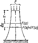 От формулы, определяющей площадь растянутого стержня без учета влияния собственного веса, эта формула отличается лишь тем, что из допускаемого напряжения вычитается величина Чтобы оценить значение этой поправки, подсчитаем ее для двух случаев. Возьмем стержень из мягкой стали длиной 10 м; для него Вполне понятно, что влиянием собственного веса при растяжении и сжатии стержней можно пренебрегать, если мы не имеем дела с длинными стержнями или со стержнями из материала, обладающего сравнительно небольшой прочностью (камень, кирпич) при достаточном весе. При расчете длинных канатов подъемников, различного рода длинных штанг и высоких каменных сооружений (башни маяков, опоры мостовых ферм) приходится вводить в расчет и собственный вес конструкции. В таких случаях возникает вопрос о целесообразной форме стержня. Если мы подберем сечение стержня так, что дадим одну и ту же площадь поперечного сечения по всей длине, то материал стержня будет плохо использован; нормальное напряжение в нем дойдет до допускаемого лишь в одном верхнем сечении; во всех прочих сечениях мы будем иметь запас в напряжениях, т. е. излишний материал. Поэтому желательно так запроектировать размеры стержня, чтобы во всех его поперечных сечениях (перпендикулярных к оси) нормальные напряжения были постоянны, Такой стержень называется стержнем равного сопротивления растяжению или сжатию. Если при этом напряжения равны допускаемым, то такой стержень будет иметь наименьший вес. Возьмем длинный стержень, подверженный сжатию силой Р и собственным весом (рис.2.18). Чем ближе к основанию стержня мы будем брать сечение, тем больше будет сила, вызывающая напряжения в этом сечении, тем большими придется брать размеры площади сечения. Стержень получит форму, расширяющуюся книзу. Площадь сечения F будет изменяться по высоте в зависимости от Установим этот закон изменения площади в зависимости от расстояния сечения