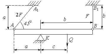 Рис.2.53 Пример 25. Абсолютно жесткий брус опирается на шарнирно неподвижную опору и прикреплен к двум стержням при помощи шарниров (рис. 2.53). Исходные данные: а = 2,1 м, b = 2,4 м, с = 1,5 м, F = 12см2, Е = 2·105 МПа. Требуется найти: 1. усилия и напряжения в стержнях, выразив их через силу Q; 2. допускаемую нагрузку [ Q ], приравняв большее из напряжений в двух стержнях допускаемому напряжению 3. предельную грузоподъемность системы Qпр. и допускаемую нагрузку [ Qпр ], если предел текучести 4. сравнить величины допускаемых нагрузок [ Q ] и [ Qпр ].