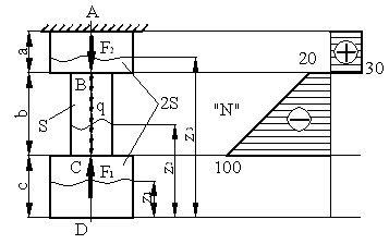 и строим эпюру W. Для стержня, изображенного на рисунке, построить эпюру нормальной силы и определить удлинение стержня, если F1 = 100 кН, F2 = 50 кН, q = 40 кН/м, а = 1 м, b = 2 м, с = 1,5 м, Е = 2×105 МПа, S = 0,2 м2. 1. Разбиваем брус на участки АВ, ВС, CD 2. Определяем значение нормальной силы на каждом участке