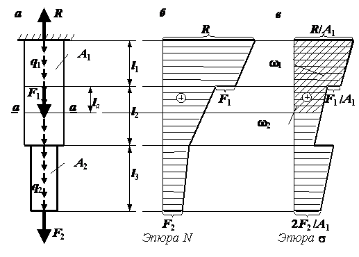 Решение. Строим эпюры изменения продольной силы и напряжений вдоль оси стержня. Собственный вес стержня принято учитывать, заменяя его распределенной по всей длине нагрузкой. Интенсивность распределенной нагрузки равна собственному весу, действующему на единицу длины стержня, т. е. на первом и втором участках