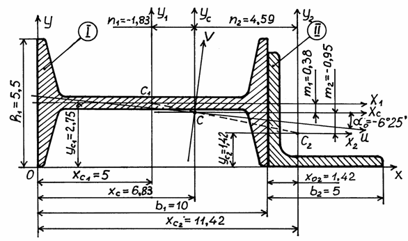 где m 1, m 2 – расстояние между параллельными осями X 1 и ХС, X 2 и ХС соответственно; n 1, n 2 – расстояние между параллельными осями Y 1 и Y c, Y 2 и Y c соответственно. На основании данных чертежа получим: