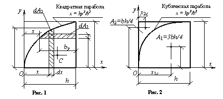 Ответ к рис. 1: Sx = bh2/ 2; Sy = hb2/ 2. Определить координаты центра тяжести плоского сечения, ограниченного осью х, квадратной параболой x = hy2/b2 и прямой линией х = h (рис. 1). Определить координаты центра тяжести плоского сечения, ограниченного осью х, кубической параболой x = hy3/b3 и прямой линией x = h (рис. 2). Определить координаты центра тяжести плоского сечения, ограниченного осью у, кубической параболой x = hy3/b3 и прямой линией у = в (рис. 2).