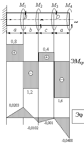 Рис.5.10 Пример 7. К стальному валу (см.рис.5.10) приложены скручивающие моменты: М1, M2, M3, M4. Требуется: 1) построить эпюру крутящих моментов; 2) при заданном значении 3) построить эпюру углов закручивания; 4) найти наибольший относительный угол закручивания. Дано: М 1 = М 3 = 2 кНм, М 2 = М 4 = 1,6 кНм, а = b = с = 1,2 м,
