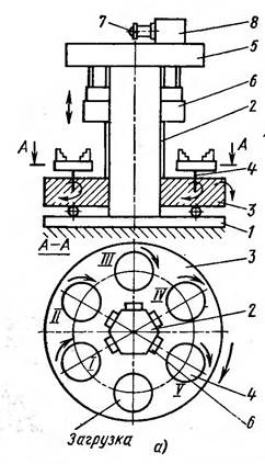 На основании 1 установлена неподвижная шестигранная колонна 2, вокруг которой периодически поворачивается стол 3 с шестью шпинделями 4. Пять суппортов 6 обслуживают одновременно пять шпинделей. Заготовку устанавливают в загрузочной позиции, и после поворота стола на 1/6 оборота шпиндель получает вращение. Начинается обработка в позиции 1, а продолжается в позициях II—V. В каждой позиции выполняется один или несколько переходов. Привод станка состоит из электродвигателя 7, редуктора 8 и механизма подач 5. Принципиальная схема полуавтомата параллельного действия