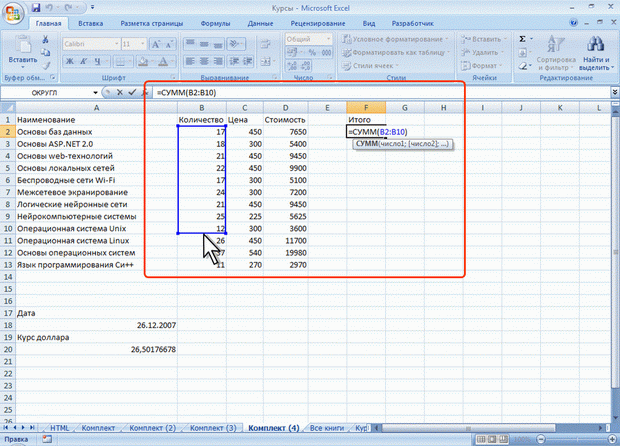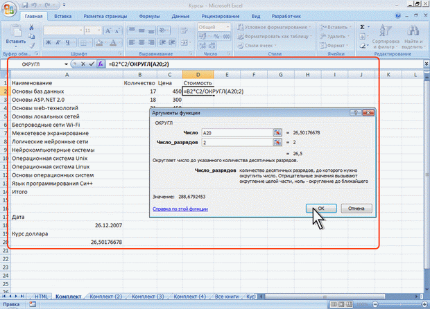 Рис. 6.11. Редактирование формулы В процессе редактирования можно запускать мастер функций. Например, в существующую формулу в ячейку D2 в таблице на рис. 6.1 можно добавить оператор " / " (деление) и в качестве аргумента округление значение ячейки А20. В этом случае после ввода знака " / " (деление) следует любым способом ввести функцию ОКРУГЛ и ее аргументы (рис. 6.12).