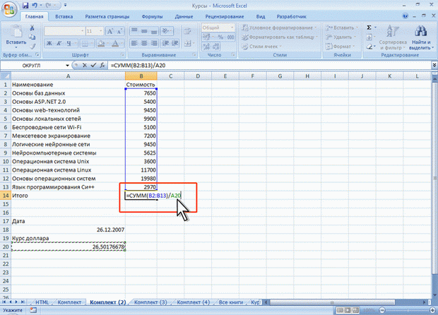 Рис. 6.10. Изменения аргумента формулы Для того чтобы заменить ссылку следует ее удалить, а затем выделить мышью новую ячейку или диапазон ячеек. В формулу можно добавлять новые операторы и аргументы. Например, в существующую формулу в ячейку В14 в таблице на рис. 6.8 можно добавить оператор " / " (деление) и аргумент А20 (рис. 6.11).