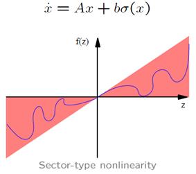 Теорема B.M. Попова об абсолютной устойчивости. Для исследования устойчивости систем со статической нелинейной характеристикой, удовлетворяющей определенным ограничениям, В.М.Поповым был предложен простой способ аналогичный частотным методам анализа устойчивости линейных систем. Этот способ позволяет оценить так называемую абсолютную устойчивость, т.е. экспоненциальную устойчивость «в малом» при любой форме нелинейности из ограниченного диапазона. Обсудим суть метода для системы, структурная схема которой изображена на рис. 3 при условии, что v = 0.
