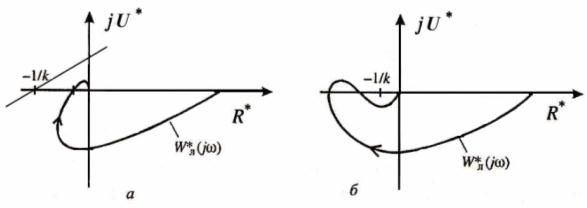 причем линейная часть должна быть устойчива, т. е. Приведем без доказательства следующую формулировку графической интерпретации условий теоремы В.М. Попова. Нелинейная система будет абсолютно устойчивой, если можно подобрать хотя бы одну прямую, проходящую через точку комплексной плоскости с координатами ( Здесь под видоизмененной амплитудно-фазовой характеристикой линейной части