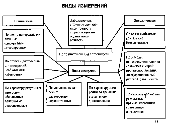 Вид измерений – часть области измерений, имеющая свои особенности и отличающаяся однородностью измеряемых величин. На рис. 1.2 показана классификация видов измерений. По способу получения численного значения измеряемой величины Прямое измерение – измерение, при котором искомое значение физической величины получают непосредственно (измерение температуры термометром, длины – линейкой). Термин «прямое измерение» возник как противоположный термину «косвенное измерение». Строго говоря, измерение всегда является прямым и рассматривается как сравнение величины с её единицей. В этом случае лучше применять термин «прямой метод измерений». В качестве примера можно привести измерение длины рулеткой, силы тока – амперметром, массы на весах. Прямые измерения проводят следующими основными методами: непосредственной оценки, сравнения с мерой, нулевым, замещением, дополнением и дифференциальным. Косвенное измерение – определение искомого значения физической величины на основании результатов прямых измерений других физических величин, функционально связанных с искомой величиной. Например, определение плотности ρ тела цилиндрической формы по результатам прямых измерений массы m, высоты h и диаметра D. Совокупные измерения – это проводимые одновременно измерения нескольких одноимённых величин, при которых искомые значения величин определяют путём решения системы уравнений, получаемых при измерениях этой величины в различных сочетаниях. При этом надо учесть, что для определения значений искомых величин число уравнений должно быть не меньше числа этих величин. Например, значение массы отдельных гирь набора определяют по известному значению массы одной из гирь и по результатам измерений (сравнений) масс различных сочетаний гирь. Совместные измерения – это проводимые одновременно измерения двух или нескольких неодноименных величин для определения зависимости между ними. Как видно из приведённых определений, совокупные и совместные измерения весьма близки друг к другу. Отличие состоит в том, что при совокупных измерениях одновременно определяют несколько одноимённых величин, а при совместных – разноимённых. Наиболее известный пример совместных измерений – определение зависимости сопротивления резистора от температуры. По числу измерений Однократное измерение – это измерение, выполненное один раз. На практике большинство измерений являются однократными. Например, измерение конкретного момента времени по часам обычно производят один раз. Но при этом надо иметь ввиду, что весьма велика возможность грубой ошибки – промаха. Во многих случаях рекомендуется выполнить не менее двух-трёх измерений, памятуя известный принцип «семь раз отмерь, один раз отрежь». Многократное измерение – измерение физической величины одного и того же размера, результат которого получен из нескольких следующих друг за другом измерений, т.е. состоящее из ряда однократных измерений. Его проводят для уменьшения влияния случайной составляющей погрешности измерения. По характеру измерений во времени Статическое (от греч.) измерение – измерение физической величины, принимаемой в соответствии с конкретной измерительной задачей за неизменную на протяжении времени измерения. Динамическое (от греч. – сила) измерение – это измерение изменяю