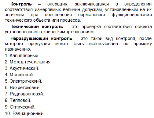 Контроль – операция, заключающаяся в определении соответствия измеряемых величин допускам, установленным на их значения для обеспечения нормального функционирования технического объекта или процесса. Суть контроля сводится к осуществлению двух основных этапов: 1. Получение информации о фактическом состоянии некоторого объекта, о признаках и показателях его свойств. Эту информацию можно назвать первичной. 2. Сопоставление первичной информации с заранее установленными требованиями, нормами, критериями, т.е. обнаружение соответствия или несоответствия фактических данных требуемым. Информацию о рассогласовании (согласовании) фактических и требуемых данных можно назвать вторичной. Таким образом, первый этап контроля – это измерение параметров объекта, а второй – логическая операция по сопоставлению результатов измерения и требуемых характеристик. Технический контроль – это проверка соответствия объекта установленным техническим требованиям. По влиянию на объект контроля, в результате которого объект (продукция) может сохранить свои свойства или необратимо изменить их, его делят на неразрушающий и разрушающий. Неразрушающий контроль – это такой вид контроля, после которого продукция может быть использована по прямому назначению. Неразрушающие методы позволяют вести сплошной контроль. Необходимость перехода от выборочного контроля к сплошному возрастает с усложнением контролируемой продукции. Из всех известных методов контроля качества наибольшими функциональными возможностями обладают физические методы неразрушающего контроля, которые в настоящее время являются самой массовой технологической операцией. В соответствии с ГОСТ 18353–79 различают следующие методы неразрушающего контроля: 1.Капиллярный метод основан на капиллярном проникновении в полость дефекта индикаторной жидкости (керосин, скипидар и др.), хорошо смачивающей материал объекта, что позволяет выявить поверхностные дефекты. 2.Методы течеискания используют для выявления только сквозных дефектов в изделиях и перегородках. 3. Акустический метод основан на регистрации параметров упругих волн, возникающих и (или) возбуждаемых в объекте контроля. 4. При магнитном методе анализируют взаимодействие магнитного поля с контролируемым объектом. 5. Электрический метод основан на регистрации параметров электрического поля, взаимодействующего с контролируемым объектом (собственно электрический метод), или поля, возникающего в объекте контроля в результате внешнего взаимодействия (термоэлектрический и трибоэлектрический методы). 6. Вихретоковый метод реализован на основе анализа взаимодействия электромагнитного поля вихретокового преобразователя с электромагнитным полем вихревых токов, наводимых в контролируемом объекте. 7. Радиоволновой метод использует регистрацию изменений параметров электромагнитных волн радиодиапазона, взаимодействующих с объектом контроля. 8. Тепловой метод контроля основан на регистрации изменений тепловых или температурных полей контролируемых объектов. 9. При оптическом методе неразрушающего контроля наблюдают или регистрируют параметры оптического излучения, взаимодействующего с объектом контроля. 10. Радиационный метод контроля основан на регистрации и анализе проникающего ионизирующего излучения после 